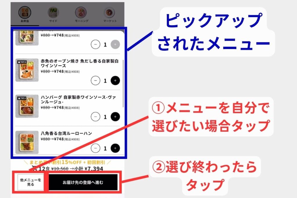 注文する食数は6食から自由に選択できるため、カートの中のメニューを増減させてあなたの好きな食数に調整しましょう。選び終わったら「お届け先の登録へ進む」をタップしてください。