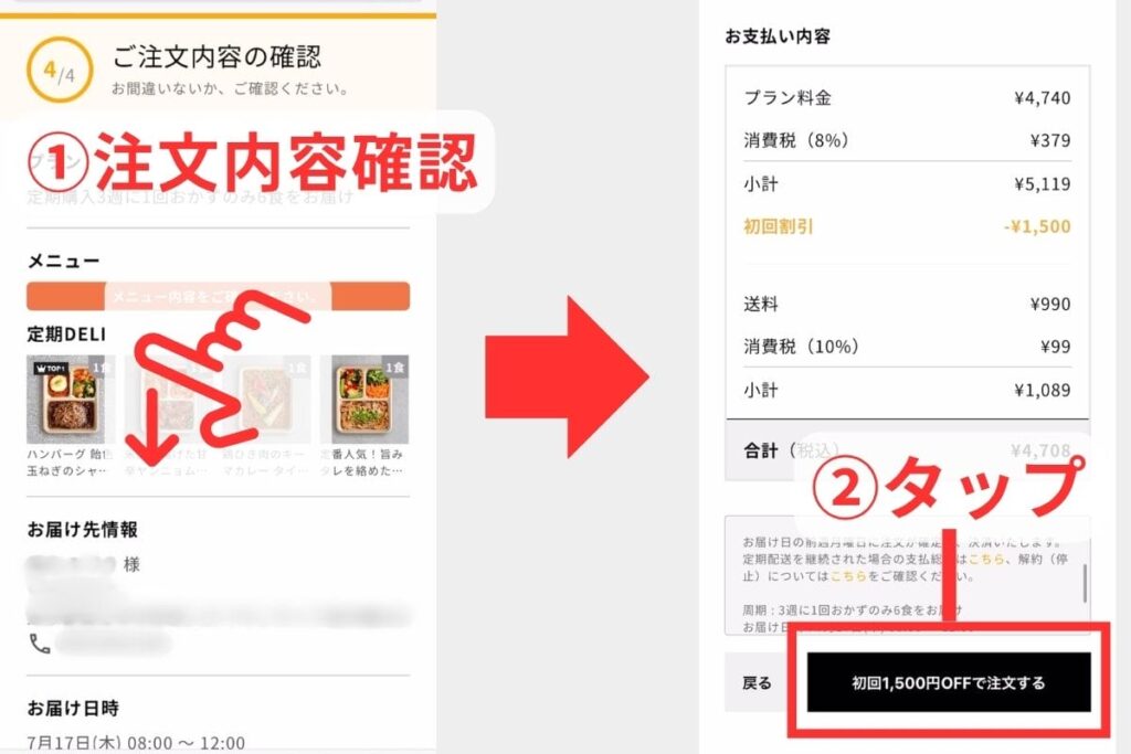 頼んだメニューや入力した情報などが表示されるため、間違いないかをチェックして「初回2,300円OFFで注文する」ボタンをタップします。